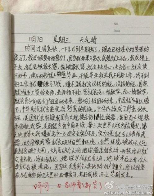 作文一开始,小作者就表达了他的忧虑之情。文中说“时间过得真快,一下就到半期考了,现在已经在开始紧张的复习了,我必须要开始努力了。”之后,小作者就开始他强大的“蝴蝶效应”思维,从如果不努力,成绩就上不去;到成绩上不去,就会被家长骂;之后,小作者又担心被家长骂,就会失去信心;再之后,如果不好好读书会引发第三次世界大战,继而引发核战,最终导致人类消失!文章结尾:“为了全人类的生命财产安全,我要在就剩下的几天里好好复习,不让悲剧发生。”这篇作文经老师审阅,批文:“呵呵。老师看了都笑了。”