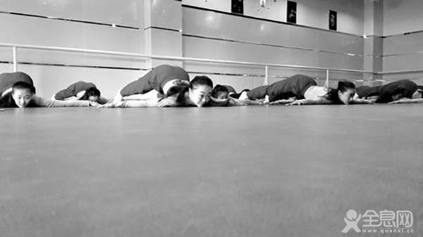 每天早上5点半,天还未亮,孩子们就要起来练早功了,压腿、劈叉、下软腰……每个基本项目都要练,丝毫不能懈怠。两个小时后,他们才能吃早饭。 45分钟的早饭时间结束后,便是一上午的练习,从8点半开始一直到12点,不间断地在舞蹈室练。中午休息两个小时后,又是4个半小时的课程。除去晚饭时 间,一直要练到晚上10点半左右才结束。一天24小时,几乎要练习舞蹈12小时左右。很多时候,有的孩子中午都不休息,累了便趴在地上休息一会儿,片刻之 后起身接着练。