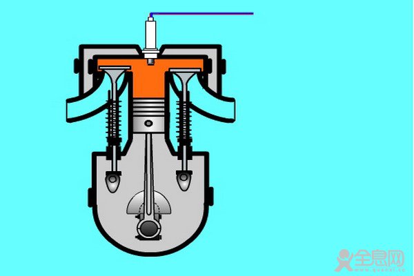 压缩结束时虽然温度较高,但未能达到燃料的燃点。在压缩冲程结束的瞬间,火花塞产生电火花,使燃料猛烈燃烧,产生高温高压气体,高温高压燃气推动活塞由上向下运动,通过连杆带动曲轴转动。实现了内能向机械能的转化。这是第三个冲程