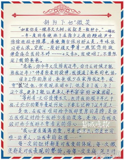 “2011年,孩子的爸爸被调到高速四大队工作,这几年,不是大年三十晚上值班,就是初一值班,无法和家人团圆吃饭。”夏清说,今年春晚的节目里,诉说父子内心情感的歌曲《父亲》让女儿感触很深,正好开学后,老师也布置同学写一篇关于春节的作文。“女儿就根据自己的感受写下了这篇作文《斜阳下45°微笑》。”