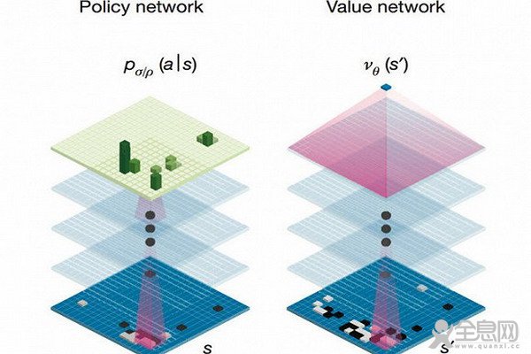 围棋的搜索空间可由广度和深度来表示。搜索广度是指在当前棋局下的下一步落子的范围,而搜索深度是指未来的步数。由于不可能穷举搜索空间,围棋程序本质上都在追求缩小搜索空间的广度和深度。阿法狗的“策略网络”负责减少搜索的广度——针对当前棋局,判断下一步该在哪里落子,判断结果表述为落在不同位置的概率;阿法狗的“价值网络”则负责减少搜索的深度——对每一个棋局,判断赢棋的概率;根据未来棋局的赢棋概率来决定是否需要继续搜索下去。阿法狗采用“蒙特卡洛树搜索”算法将“策略网络”和“价值网络”综合起来决定走哪一步。