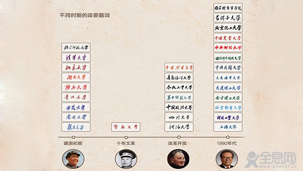据统计,我国113所"985"、"211"高校中,有92所校名出自政要手迹,其中52所是政要特意为该校题写的。
