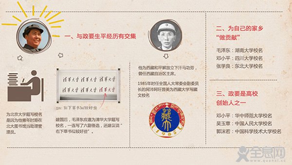 第三种情况则是政要是高校创始人之一。邓小平作为华中师范大学前身之一的中原大学创始人之一,在1985年更名为华中师范大学时,为该校题写校名。中国人民大学校名则由老校长吴玉章手书,中国科学技术大学校名由首任校长郭沫若题写。
