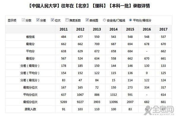 举个例子,中国人民大学往年录取情况(如下图),2011年-2017年录取平均分分别是638分、629分、672分、658分、684分、662分(2016年无分值显示),再拿这些数据和历年的批次线做对比,找出差值。