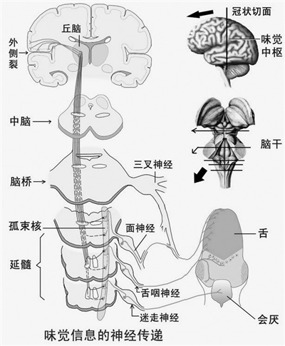 味觉和其他感觉一样要传入大脑皮层才可以被感知。传递味觉信息的神经包括第7对、第9对、第10对脑神经,即面神经、舌咽神经、迷走神经。它们把信号传到延髓孤束核,换神经元后再传给丘脑,最后传到前岛和额叶盖区的味觉皮层。味觉皮层的位置从侧面看正好在大脑的中央。