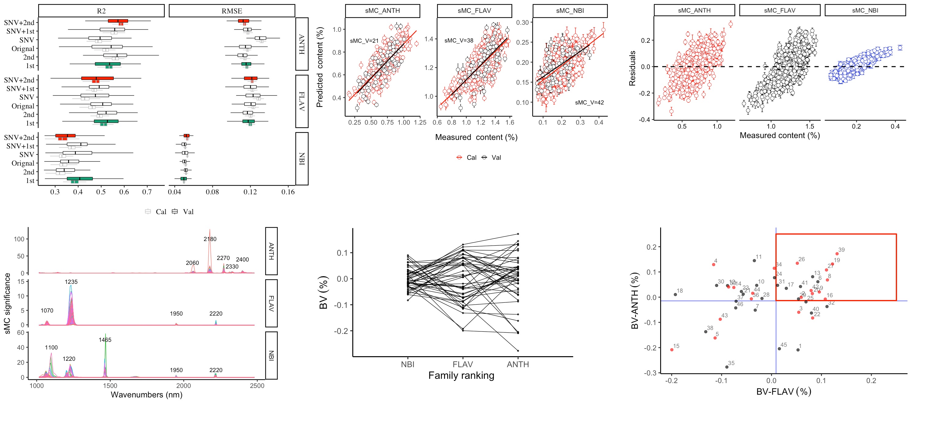 为在短时间内完成50个家系的1500株檫木幼苗的叶色指标、叶绿素,以及叶片营养指标等性状的快速预测,中国林业科学研究院亚林所林木种质资源团队将檫木的叶色指标、叶绿素以及叶片营养性状指标进行了研究,克服了水分对叶片近红外光谱的影响,阐明了近红外光谱与叶片特定性状的作用规律,对比了不同光谱预处理方法对相关性状预测模型精度的影响,通过显著多元相关算法 (sMC)和偏最小二乘法(PLSR)构建了稳定的叶色指标、叶绿素以及叶片营养性状等多指标的sMC_PLS高精准预测模型,并创新使用了一种可靠的模型校准统计方法,分析模型的稳定性和误差,筛选出了特定叶色及营养状态良好的优良檫木单株,实现了无损快速预测。