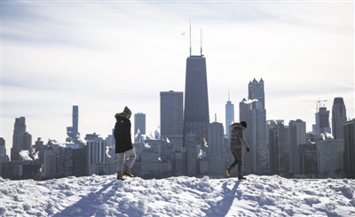 全球变暖加剧了气候系统的不稳定性,引发对海洋安全、气候安全的忧虑。海洋孕育了厄尔尼诺、拉尼娜、台风等现象,催生了地球上破坏力极强、影响广泛的极端天气事件。图为2021年2月7日,人们走过美国芝加哥的积雪。当日,寒潮侵袭芝加哥地区,风寒指数达零下20摄氏度至零下25摄氏度。