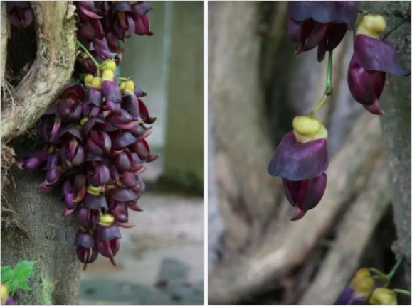 实际上它的学名叫常春油麻藤(Mucuna sempervirens)。它是豆科黧豆属植物。它的花非常有意思,花儿不是长在枝丫上,而是一串串的扎堆长在藤蔓上,古藤四处盘旋,藤蔓上长出无数串的花,一簇簇、一堆堆,如成千上万只的麻雀聚在一起,热闹非凡。它的藤条也深受孩子们的喜欢,柔韧、结实,使它成为了很好的天然“秋千”。