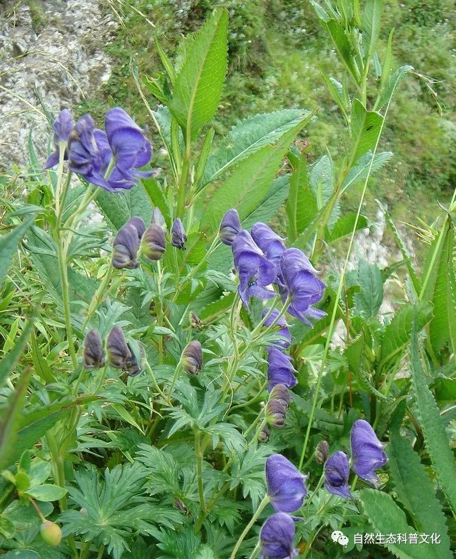 冷杉林阴湿处也是乌头属很多植物生长的好环境,它们大多生长在杜鹃林、冷杉林及林缘中,花型奇特,花色蓝紫,花的上萼较大,像一个头盔戴在其他萼片的上部,秀于林中。缺刻乌头在冷杉林中最为常见,德钦乌头分布在冷杉林中,因其含有二帖类生物碱,被认为是有毒的成分,当地民族常用其块根制作毒箭,狩猎时发挥着很大的作用。