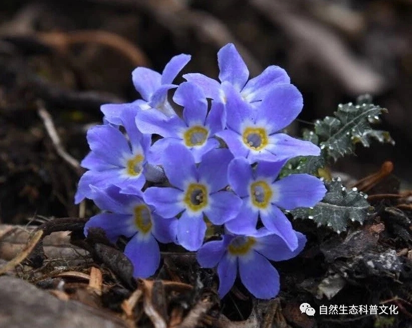 苣叶报春与驴蹄草同生在积水潮湿环境中,多年生草本植物,冬季由多个大的苞片保护,5月杜鹃开花时节展开似蒲公英叶裂的轮生叶片,花序柄长10厘米至15厘米,上部着生30余朵淡蓝紫色小花。
