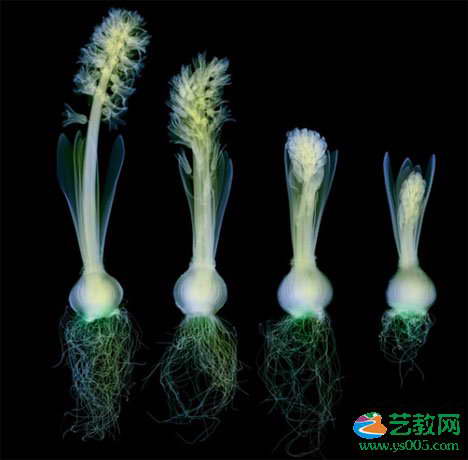 复杂而美丽的结构:接骨木花(左上)、黑种草(右上)、火鹤花(左下)和蓟(右下)。这些彩色的X光照片帮助我们更深刻地认识自然界的复杂美。这些表面上看起来简单的花朵,在X光下显露出它们隐藏于内部的复杂而美丽的结构。这些看起来平淡无奇的植物,在X光下显露出它们真正奇异的本质。