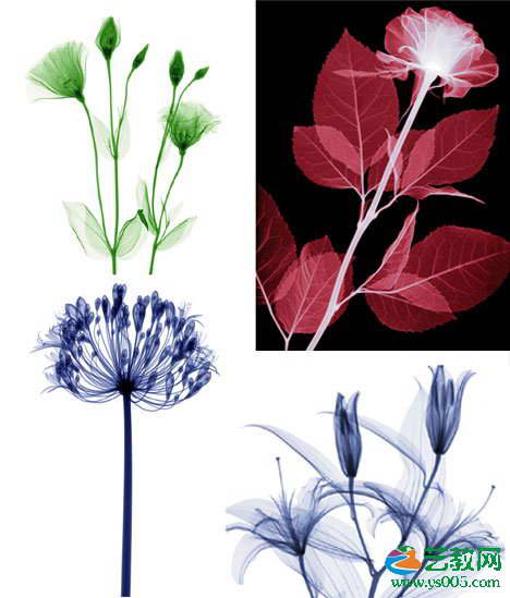 隐藏的美:洋桔梗花(左上)、玫瑰(右上)、百子莲(左下)和百合花(右下)。尽管特维并不是第一个将X光当作艺术的艺术家,但他却是最著名、最受尊重的一位。他的X光艺术以一种完全新奇的方式来描述我们熟悉的事物。特维的X光照片表现了普通事物那种长期被隐藏的美,有时候人们可以从照片中发现最普通事物的最迷人特性。