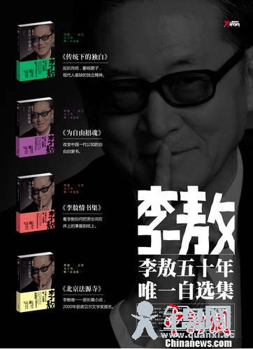 中新网8月23日电 “李敖50年唯一自选集”将于近日出版。据出版方介绍,该套自选集共13册,《传统下的独白》、《为自由招魂》、《李敖情书集》、《北京法源寺》等四册先行上市。其中,《北京法源寺》是李敖唯一一部长篇小说,2000年曾获诺贝尔文学奖提名。
