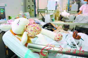 7月11日,妞妞的病床床头放着爱心人士送来的娃娃。新华社发