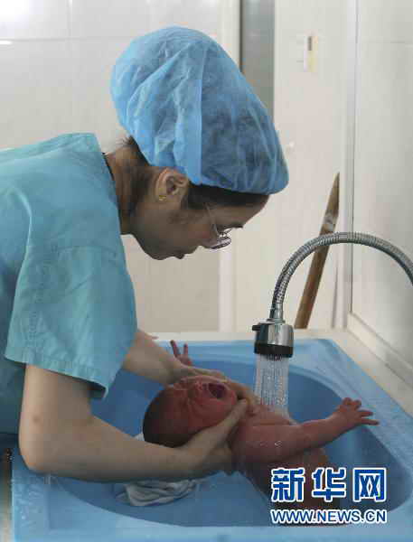 7月11日,在湖北省襄阳市第一人民医院新生儿区,护士在为新生儿洗澡。新华社发(龚波 摄)