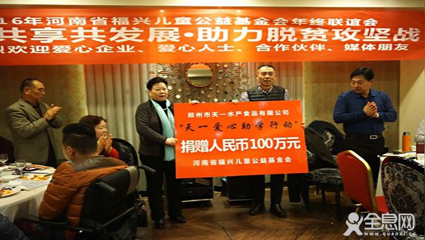 1月14日下午,河南省福兴儿童公益基金会“共建共享共发展·助力脱贫攻坚战”年终联谊会在郑州举行。郑州市天一水产食品有限公司向河南省福兴儿童公益基金会捐赠100万元启动“天一爱心助学行动”。