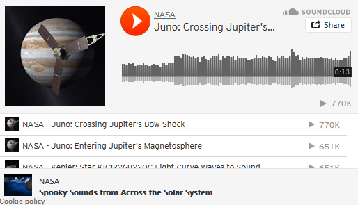 其中一些音频来自行星探索时间线的重要事件,比如朱诺号在2016年6月24日遇见了木星的强大磁场。在通过木星的弓形激波之前,这颗探测器收集了近2个小时的数据。