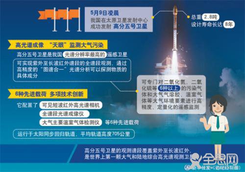 中国航天近期又有一次引人瞩目的发射。5月9日2时28分,我国在太原卫星发射中心用长征四号丙运载火箭成功发射高分五号卫星。这是世界首颗实现对大气和陆地综合观测的全谱段高光谱卫星,也是我国光谱分辨率最高的卫星。高分五号卫星的成功发射,是我国实现高光谱分辨率对地观测能力的重要标志,将满足环境综合监测等方面的迫切需求,对掌握高光谱遥感信息资源自主权,助力建设美丽中国具有重要意义。