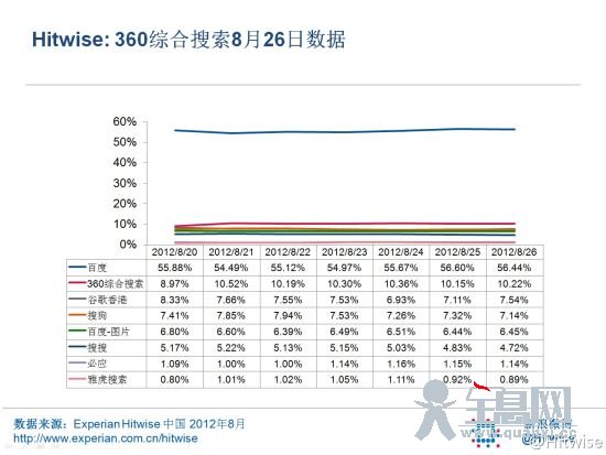在上一份监测报告中,Hitwise指出360综合搜索的流量份额从8月17日开始大幅攀升,从8月17日的0%,一直到达8月21日的10.5%。同期百度的份额从最高点的64.9%下滑到55.1%,谷歌的份额从10%下滑到7.5%,而搜狗和腾讯搜搜的流量份额均没有出现明显的变化。
