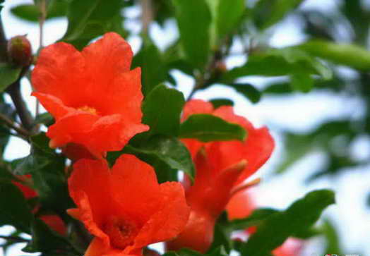 不知不觉中,郁郁葱葱的绿叶之间出现了星星点点的花儿,闪闪烁烁,若隐若现。站在树下,抬头看,石榴花婀娜多姿。有的还是花骨朵儿,像一个个可爱的“小水滴”;有的刚刚开放,展开娇嫩的花瓣,像仙女穿着的纱裙;有的露出了黄色的花蕾,正鼓着劲儿吹着小喇叭呢。看,那三朵并在一起开的石榴花,火红火红的,像熊熊燃烧的火把。