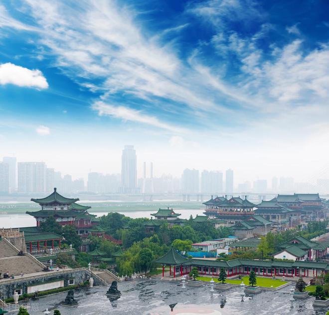 站在阁楼上,往西岸望去,高楼大厦直入云端,彰显人们的福寿康宁。江面上有来往的客船,也有人划着小舟,荡漾在水面上,水天一色、景色宜人,好不自在。