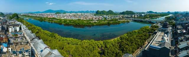 抬头仰望,洞高数丈,沿顶横裂一条隙缝,石鲤鱼从隙缝中悬跃向下,首尾和鳞鳃都很逼真。旁边还盘结着幡盖,五彩斑斓。我们登叠彩山,攀明月峰,凌空一望,果然,漓江澄碧,自西北方向款款而来,直逼明月峰下,然后向东一转,穿桂林市,绕伏波山、象鼻山,向东南而去,正像一条青丝罗带,随风飘动,而周围的山峰,在阳光和雾霭的照映中,绿的碧绿,蓝的翠蓝,灰的银灰,浓淡有致,层次分明;真像是美人头上的装饰,清秀淡雅。
