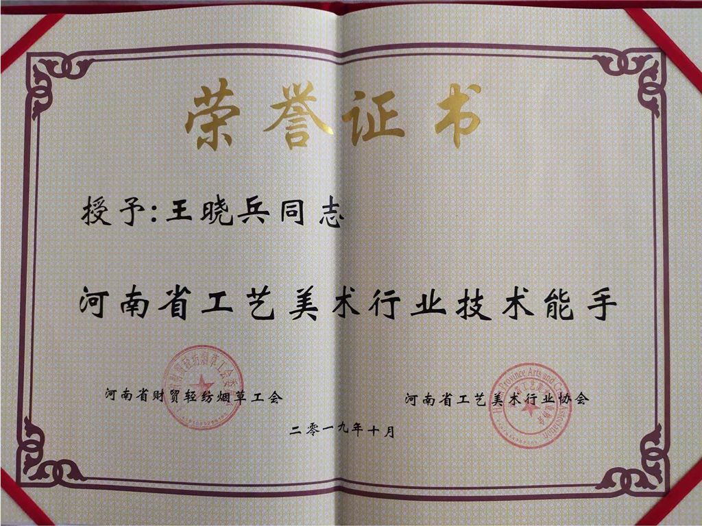 王晓兵在汝瓷艺术领域屡获殊荣,2020年荣获《全国轻工技术能手》称号,并在2022年再次获此殊荣。2021年,他在全国职业技能竞赛(陶瓷手工成型)总决赛中荣获第五名。此外,他还被认定为《非物质文化遗产(汝瓷烧制技艺)代表性传承人》。早些年,王晓兵也屡获佳绩,2020年获得《河南省技术能手》,2019年荣获《河南省工艺美术行业技术能手》,2017年在《首届河南省传统技艺大赛》中摘得三等奖。2021年,他再获《汝州市技术能手》称号,并在河南省陶瓷行业职业技能竞赛-陶瓷手工成型工项目中夺得金奖。2020年,他还在第十三届职业技能大赛陶瓷手拉坯比赛中获得二等奖。同时,王晓兵积极参与行业交流,2022年加入《汝州市非遗协会》,2021年成为《河南省陶玻协会》会员。