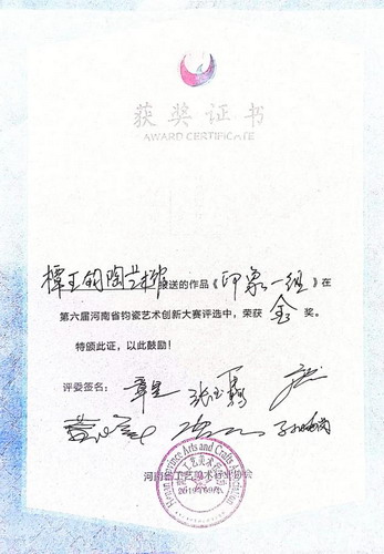 2020 年,河南省政府授予他“河南省工艺美术大师”称号。这一荣誉,是对他在陶瓷领域深厚造诣和专业能力的充分认可。王晓锋以精湛的技艺和独特的艺术风格,在钧瓷艺术的天地里独树一帜,成为行业内的标杆人物。