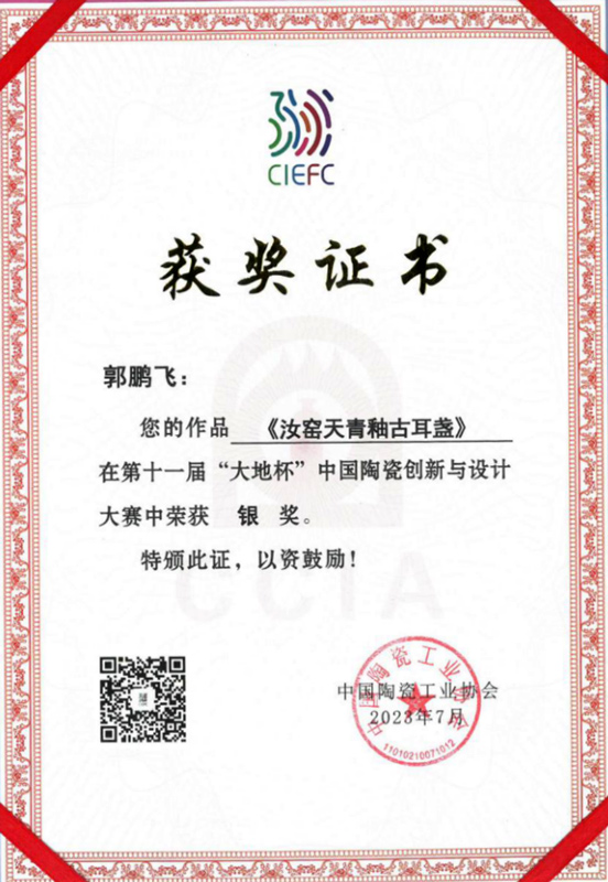 郭鹏飞大师在汝瓷艺术领域取得了不少成绩,得到了广泛的认可。他的作品多次在国内外陶瓷展览和比赛中获奖,像2012年4月在第二届中国(北流)国际陶瓷博览会产品评比中,他的作品《龙耳扁瓶》获得了铜奖;2016年9月在第二届中国历史名瓷烧制技艺大赛中,他的作品《皓月瓶》获得了优秀奖;2021年4月参加恋瓷集活动也获得了奖项。尤为突出的是,2023年7月,他的作品《汝窑天青釉古耳盏》在第十一届“大地杯”中国陶瓷创新与设计大赛中荣获银奖,同月,作品《汝窑天青釉葵花洗》在第十一届“大地杯”中国陶瓷创新与设计大赛中荣获金奖。