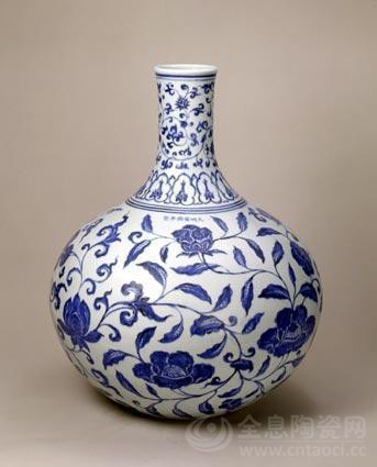 渊源:天球瓶是受西亚文化影响极深的一种瓷器造型,因圆球腹硕大,像是从天降下来似的,故名。天球瓶创烧于明代永乐、宣德年间的景德镇窑,永乐朝开始成为观赏式瓶,宣德年间较为流行。